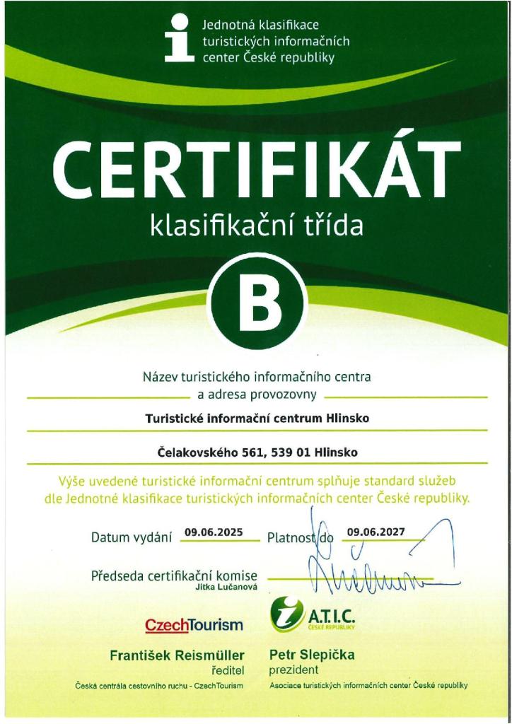 TIC Hlinsko je členem Asociace turistických informačních center České republiky. Několikrát jsme se umístili na předních pozicích v soutěži Informační centrum roku. Jsme držiteli certifikátu Cyklisté vítáni.